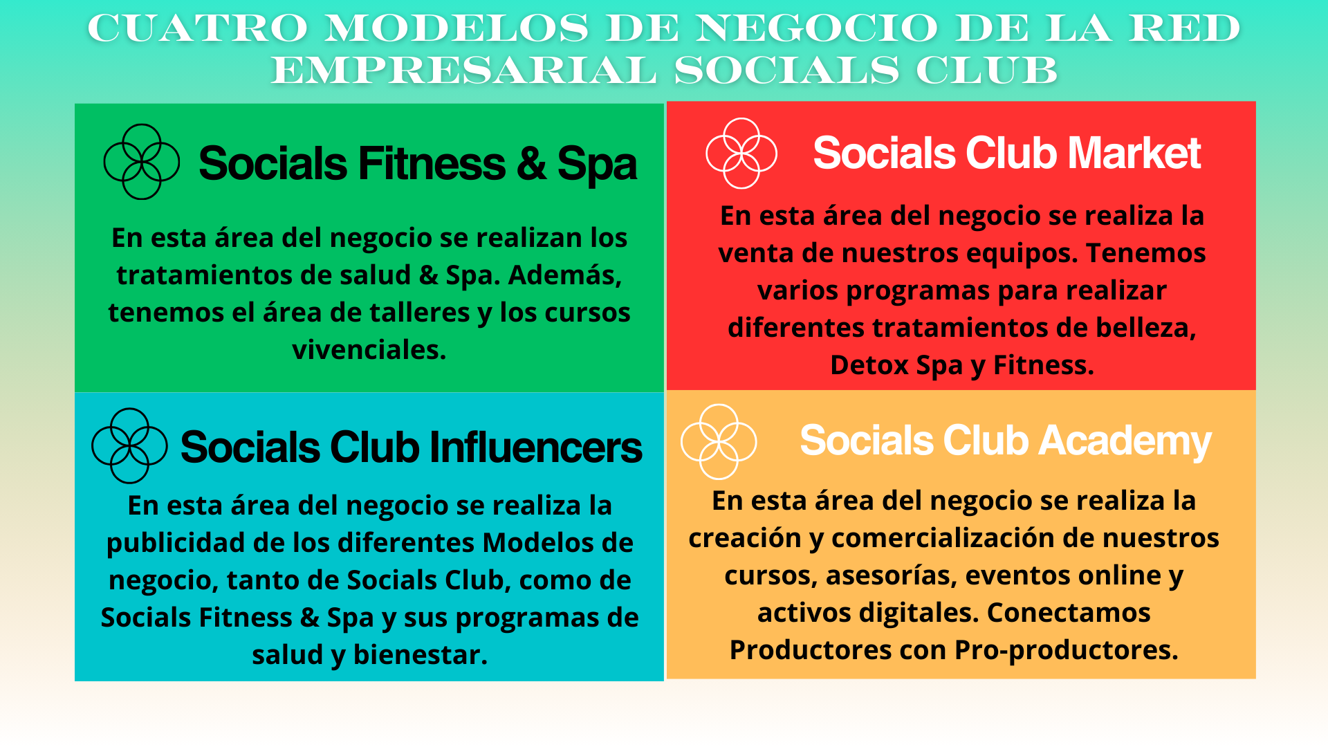 En esta área del negocio se realiza la publicidad de los diferentes Modelos de negocio, tanto de Socials Club, como de Socials Fitness & Spa y sus programas de salud y bienestar.