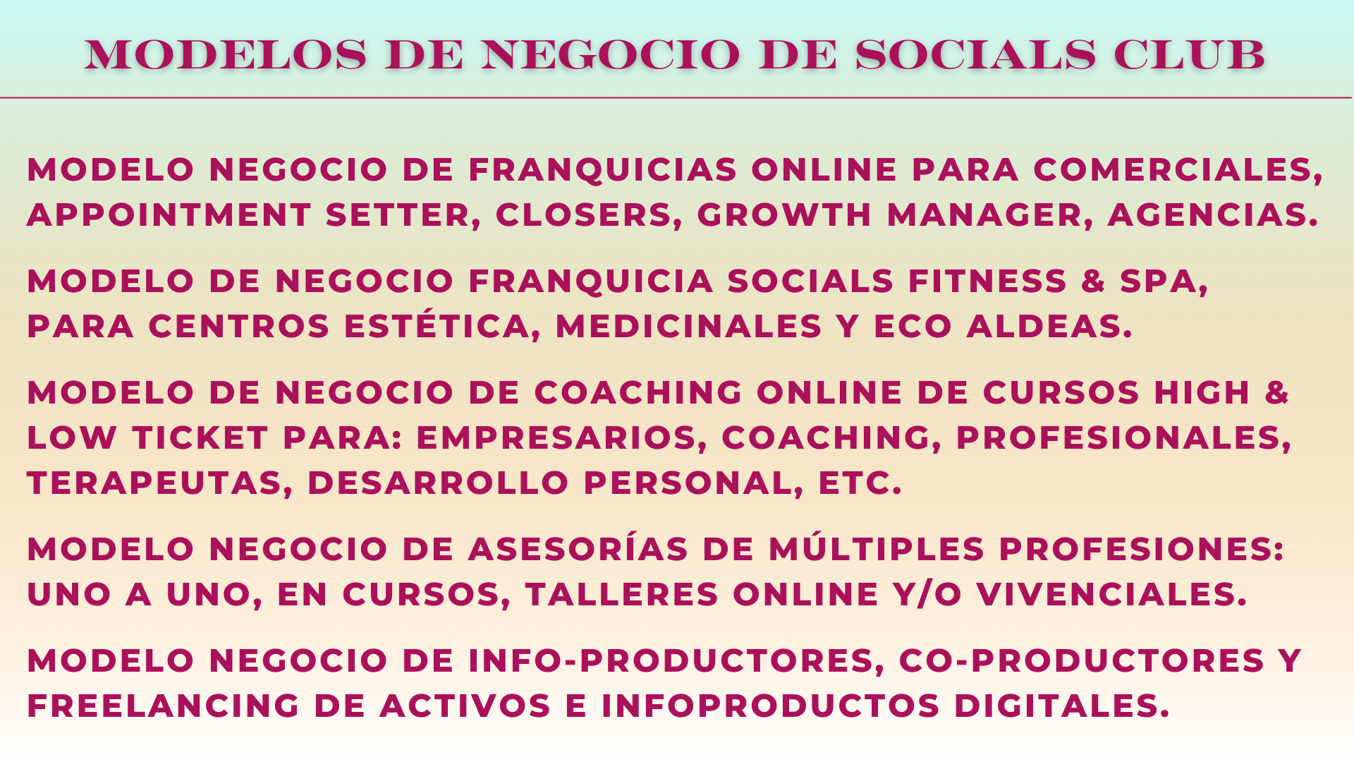 En Socials Club los Modelos de negocio, son para realizar diferentes actividades dentro de las áreas de la franquicia.